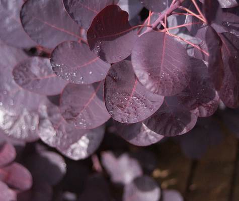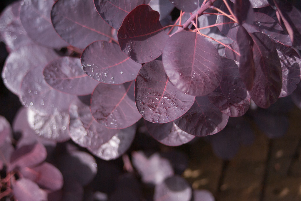 Leaves with sparkling raindrops in Grandma's garden.